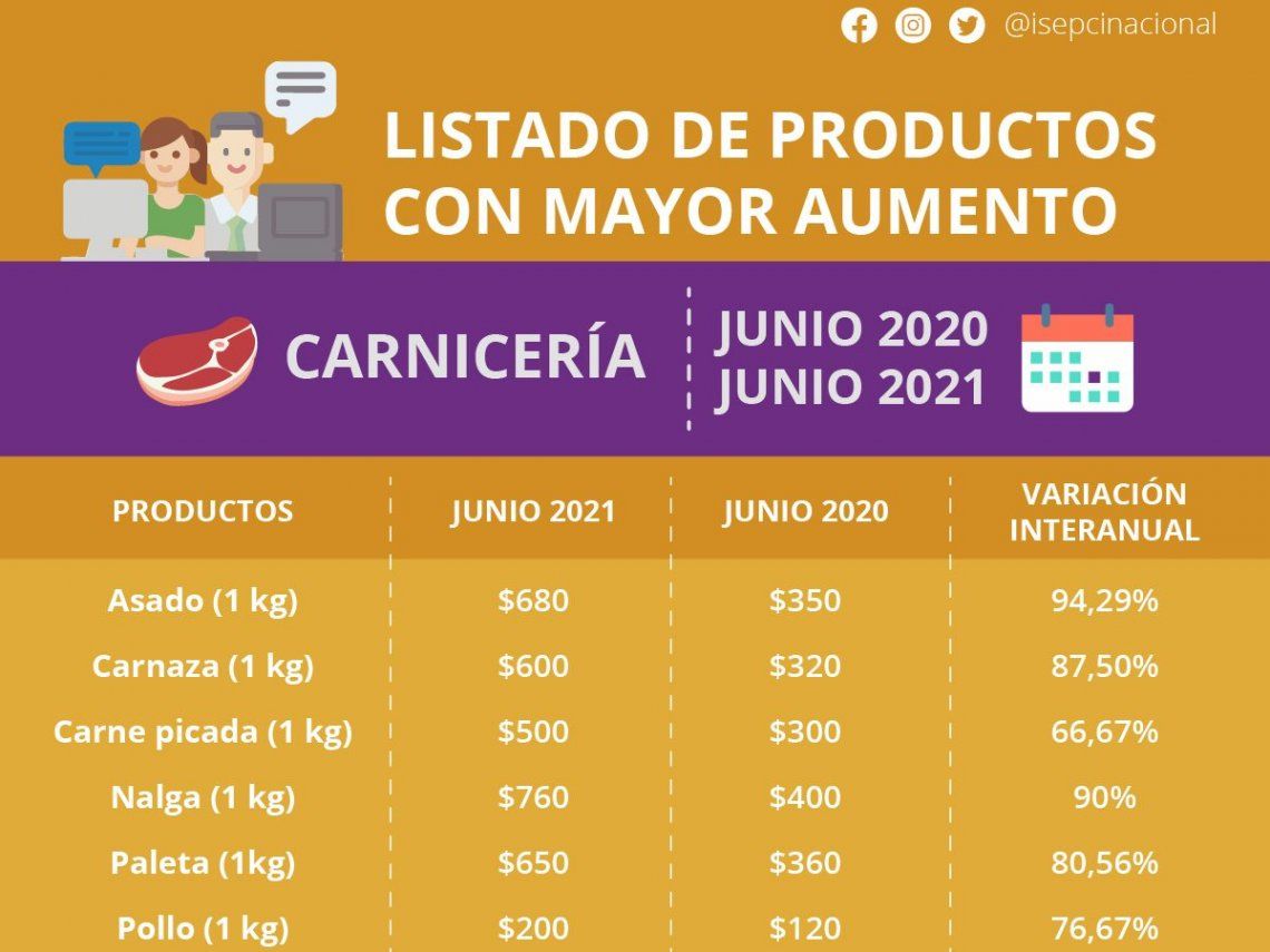 El Instituto de Investigación Social Económica y Política Ciudadana (ISEPCi) reveló que la carne aumentó 81,53% en el último año, lo que supone un nuevo récord. Mientras que el rubro almacén subió un 43,13% y, las frutas y verduras un 3,72% en el último año.